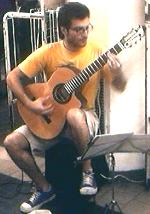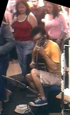 aquellos que circulan por el hall. En medio de semejante mar de gente, Jorge, guitarrista que estudió su arte en la Escuela de Música Popular de Avellaneda, sentado en un banquito junto a la columna central, hace oír la música de su instrumento.
