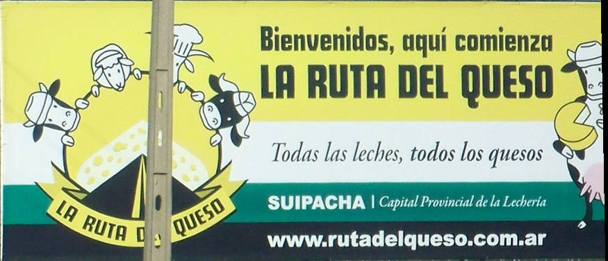 Este cartel de ruta marca el inicio de la Ruta del Queso, que corresponde al tramo de la Ruta Nacional 5 que atraviesa el Partido de Suipacha